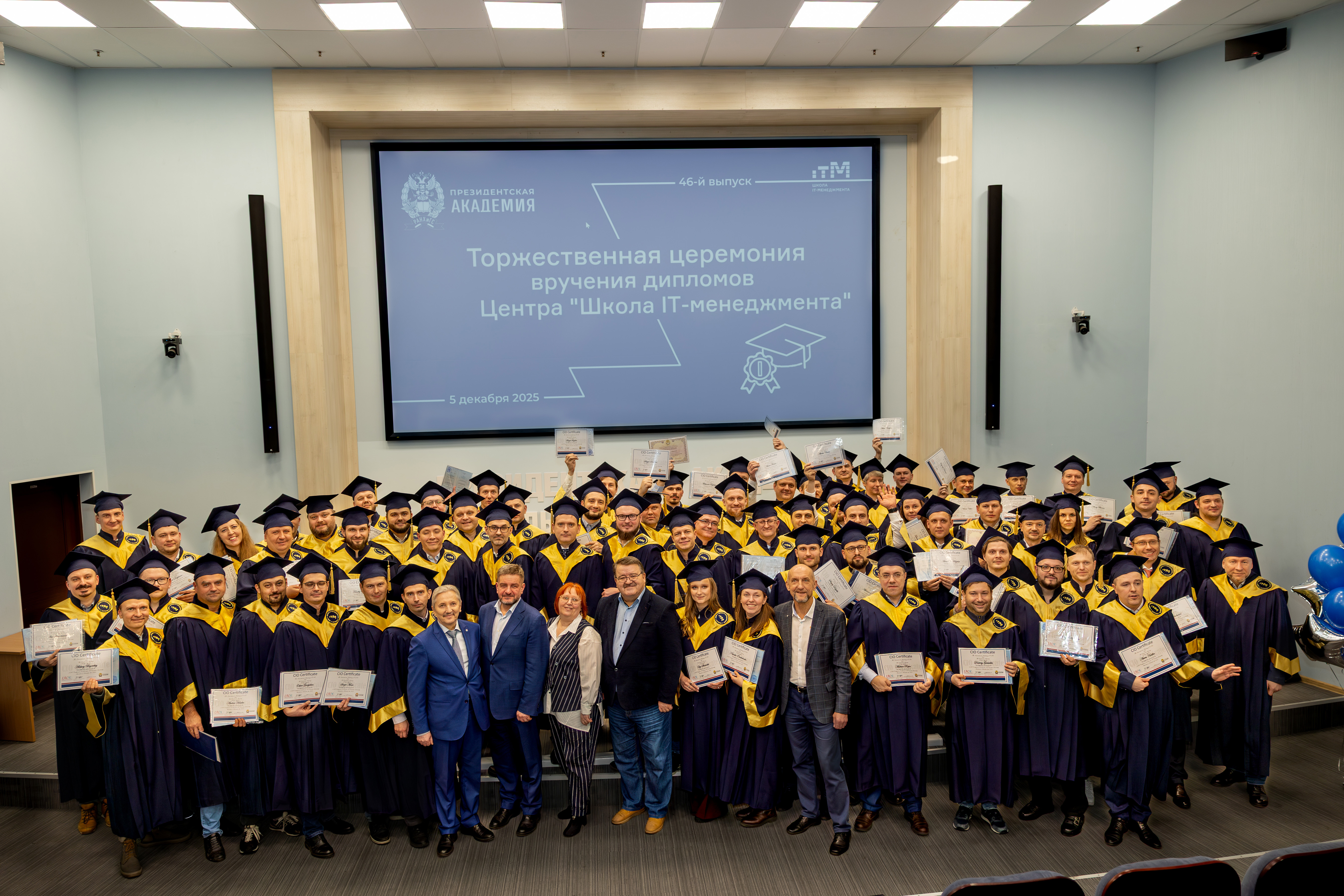 5 декабря 2025 года выпускники программы MBA CIO и MBA CSO Школы ИТ-менеджмента РАНХиГС получили свои долгожданные дипломы Президентской академии и сертификаты Международной академии CIO, а выпускники профессиональной переподготовки "IT-Менеджер: менеджер проектов, бизнес-аналитик" и " Управление корпоративной информационной безопасностью " получили дипломы Президентской академии.